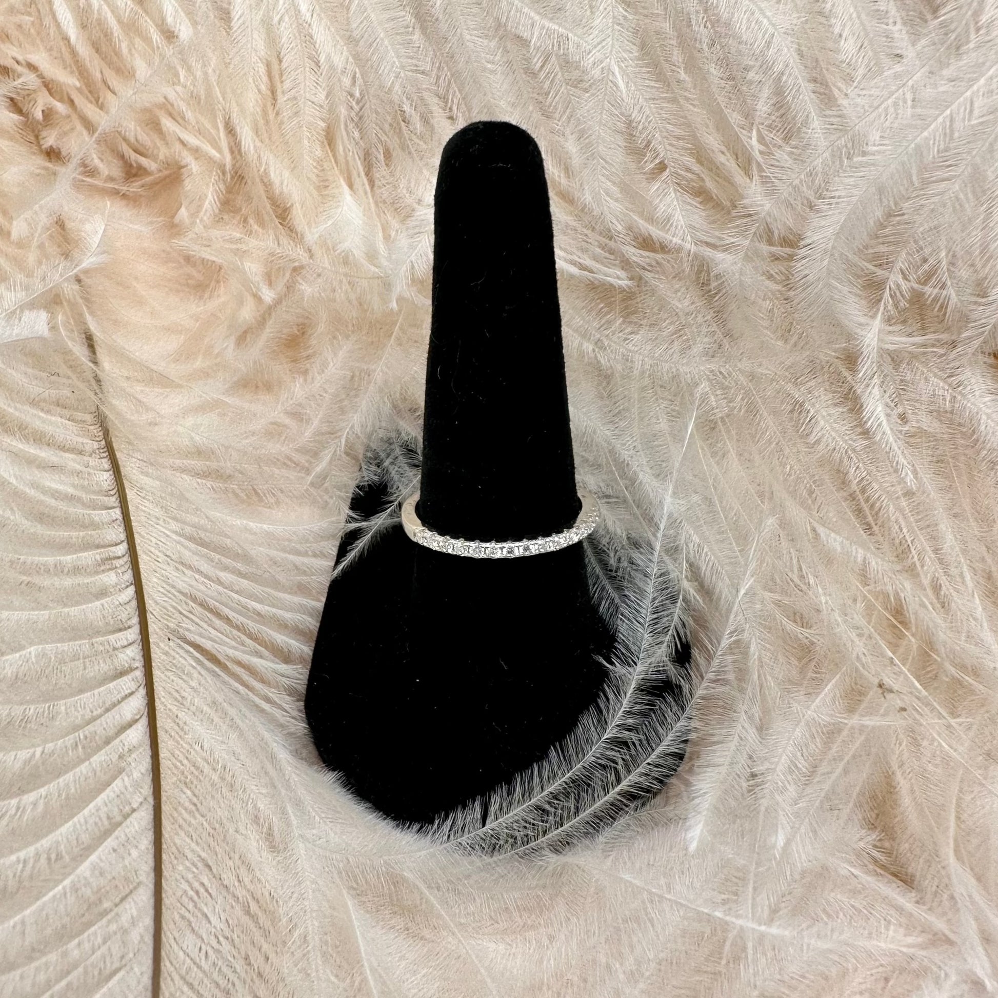 A half eternity band with fifteen .23 ct. moissanite stones. Set in a sterling silver band that is plated in white gold and rhodium with a high polish finish.