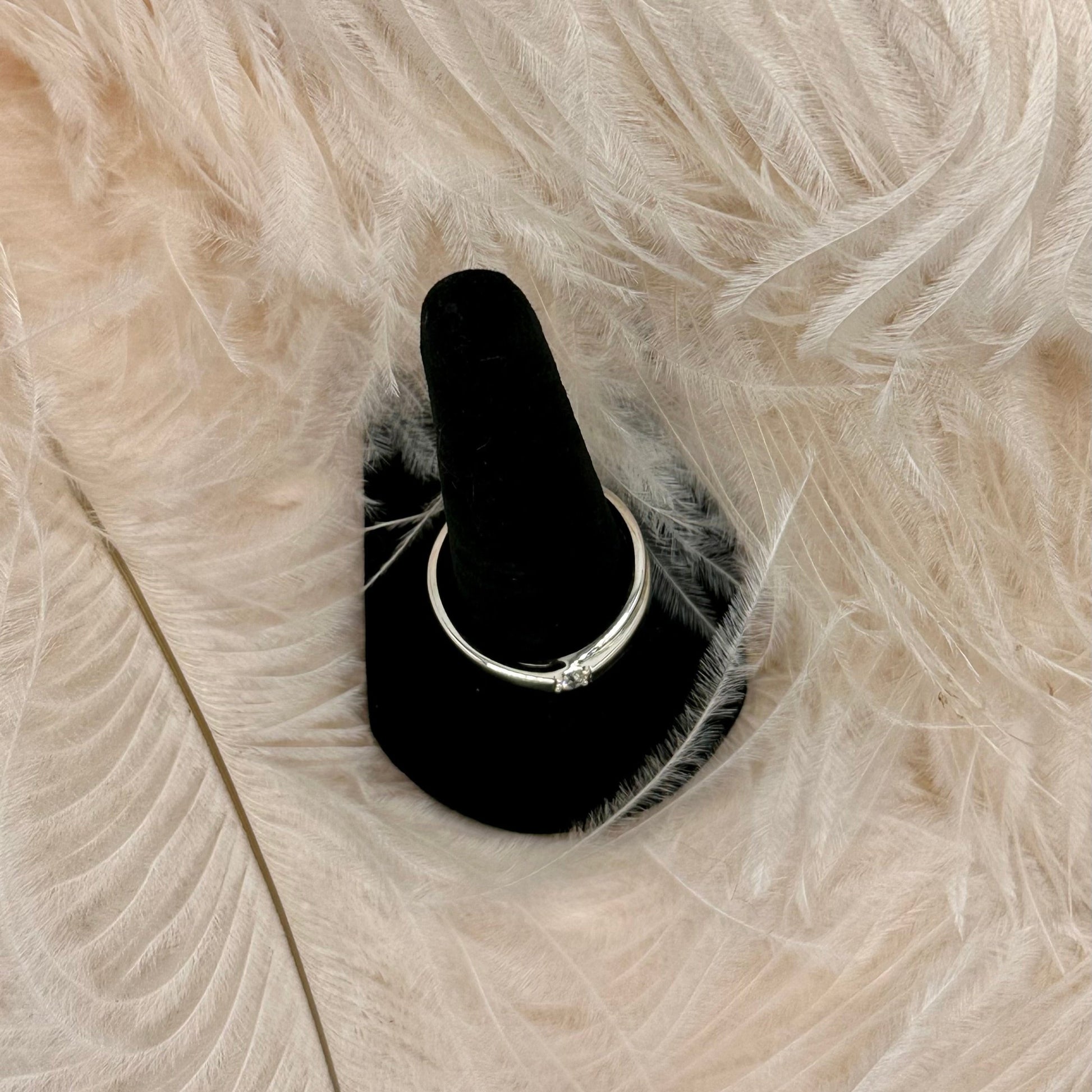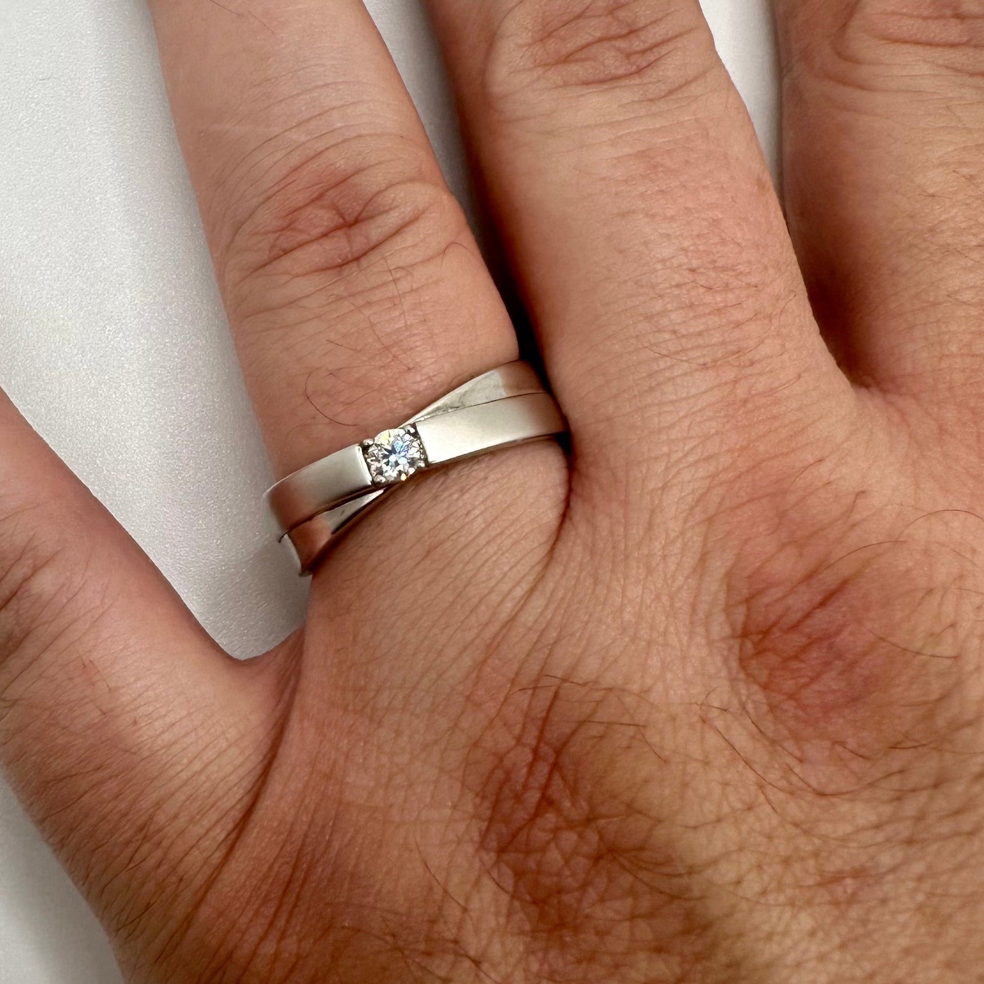 A stylish cross-style band that pairs with the Felisha, the Dylan band contains a single moissanite stone. The stone's brilliant sparkle stands out even more next to the soft satin polish of the band. Set in rhodium plated sterling silver.