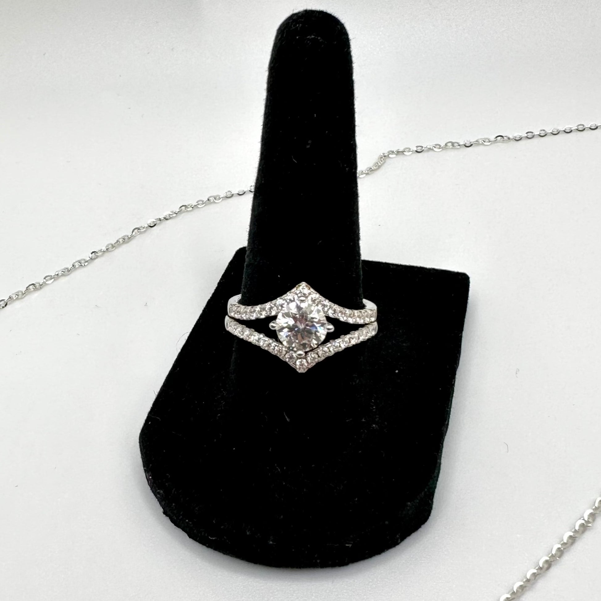A half eternity chevron band with seventeen 0.26 ct. moissanite stones. Pairs beautifully with the Olivia engagement ring. Set in a sterling silver band that is plated in white gold and rhodium with a high polish finish.