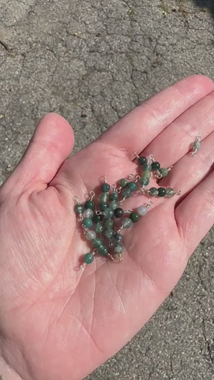 Made with 14k gold filled and Sterling silver wire. Genuine round moss agate stones, 4 mm.